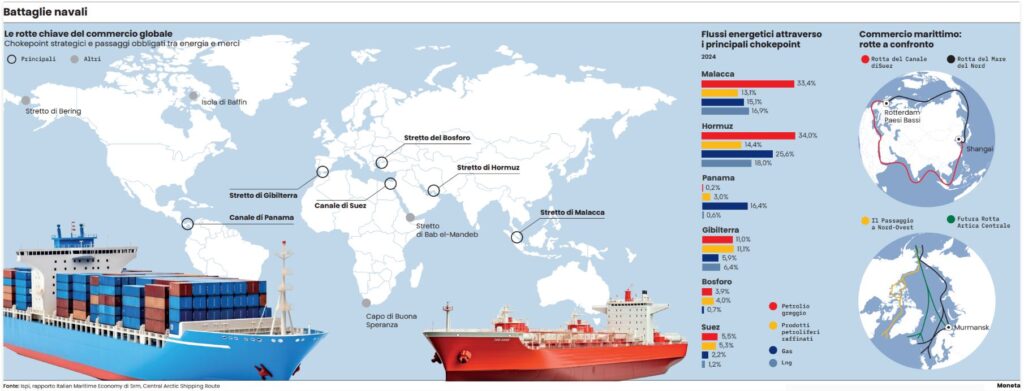 Ad agitare le acque ci sono molti altri dossier, visto che le tensioni internazionali si riverberano su tutti i chokepoint marittimi, ovvero i colli di bottiglia che rischiano di strangolare il traffico merci. A fare la parte del leone è il petrolio, che rappresenta un terzo di tutto ciò che ogni anno viaggia nelle stive delle navi: l’80% delle rotte petrolifere transita attraverso chokepoint. Il punto più caldo, al momento, sembra essere lo Stretto di Hormuz, fra gli Emirati Arabi Uniti, l’Oman e l’Iran, dove passa un quinto del traffico mondiale. Sul Golfo Persico si affacciano sei tra le maggiori potenze petrolifere globali (oltre ai Paesi citati, anche Arabia Saudita, Iraq e Kuwait) e non a caso da questa via d’acqua larga appena 20 miglia secondo l’Italian Maritime Economy 2025 di Srm (Centro Studi con sede a Napoli, collegato a Intesa Sanpaolo) transita il 27% del commercio totale di petrolio e gas. Se l’Iran bloccasse il passaggio, sarebbe una catastrofe economica globale. Ma finora Teheran, che triangola parte del suo greggio verso la Cina, ha evitato colpi di testa. D’altra parte, nel primo trimestre 2025 le importazioni cinesi attraverso lo Stretto di Hormuz sono state pari a 5,4 milioni di barili al giorno. L’esplosione delle tensioni nel regno degli ayatollah però non può non accrescere i timori. Basti pensare a ciò che è successo al Canale di Suez nel 2023 con l’inizio degli attacchi contro le navi sferrati dal gruppo islamista yemenita degli Houthi che operano nello Stretto di Bab el-Mandeb: «Oggi parliamo quasi di un canale fantasma – spiega Marcello Tadini, professore di Geografia economica e politica all’Università del Piemonte Orientale – La paura ha spostato i traffici: gli armatori preferiscono passare dal Capo di Buona Speranza, in Sudafrica, anche se questo fa lievitare i costi: evidentemente è comunque più conveniente visti i rischi nel Mar Rosso». Vanno però fatti dei distinguo: «L’impatto è diverso a seconda delle merci: fra il 2023 e il 2024 si parla di -86% per il traffico container, ma di “appena” il -32% per il crude oil. Secondo gli ultimi dati di Bimco, una delle principali associazioni internazionali di armatori, il traffico nel Canale la prima settimana di gennaio era ancora inferiore del 60% rispetto allo stesso periodo del 2023, anche se gli Houthi hanno dichiarato il cessate il fuoco da più di 100 giorni». La crisi aveva fatto tremare il Mediterraneo, che senza Suez rischiava di finire in una posizione marginale: «Si temeva un impatto molto consistente, ma non si è verificato. Le navi hanno continuato ad arrivare nei nostri porti attraverso lo Stretto di Gibilterra».