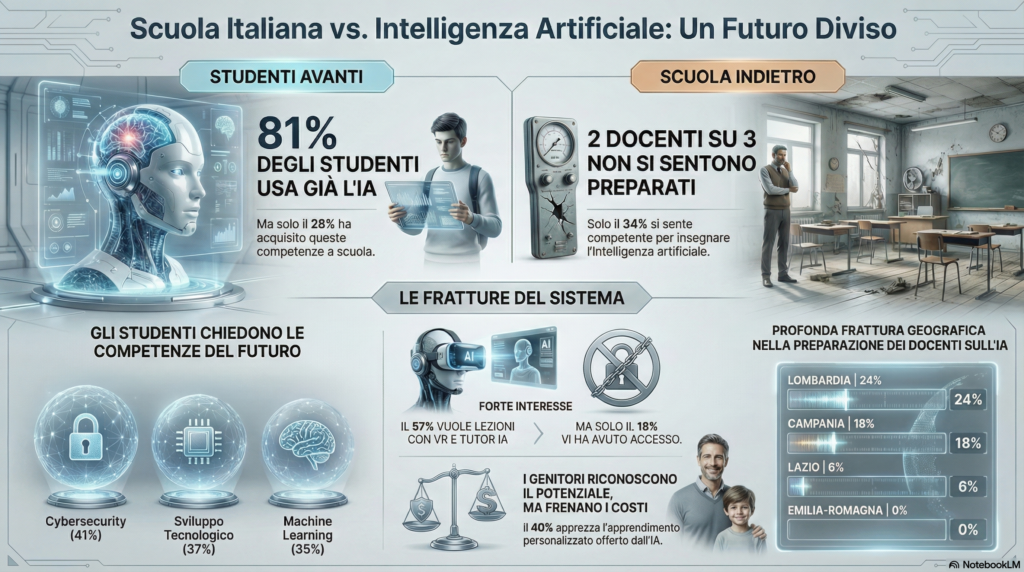 A complicare il quadro c’è una frattura geografica profonda. La Lombardia guida la classifica delle regioni più preparate, ma con numeri tutt’altro che rassicuranti: solo il 24% dei docenti risulta formato sull’IA e meno della metà degli studenti ha accesso a tecnologie avanzate.