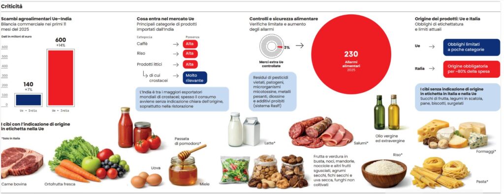 Il cambio di rotta a livello europeo sembra però confermato dall’ultimo accordo di libero scambio tra Unione Europea e India nel quale carne bovina, latte e zucchero sono stati considerati settori sensibili e sono stati esclusi da una significativa liberalizzazione, mantenendo i dazi attuali. Questa decisione mira a tutelare i mercati interni europei da potenziali effetti destabilizzanti, proteggendo la zootecnia e i produttori. Un segnale di attenzione che però non basta alla Coldiretti che alza il tiro e chiede una norma europea che renda obbligatoria l’etichetta d’origine su tutti i prodotti alimentari commercializzati nell’Unione per dare la possibilità di scelta ai cittadini. Il lavoro delle imprese agricole- spiega l’organizzazione guidata da Ettore Prandini – si tutela anche attraverso la riforma dell’attuale codice doganale, che consente autentici inganni commerciali grazie alla regola dell’ultima trasformazione sostanziale. Un segnale importante è venuto nell’ultimo consiglio dei ministri Agricoli della Ue dove un gruppo di Paesi ha chiesto una maggiore trasparenza sull’etichetta di origine.