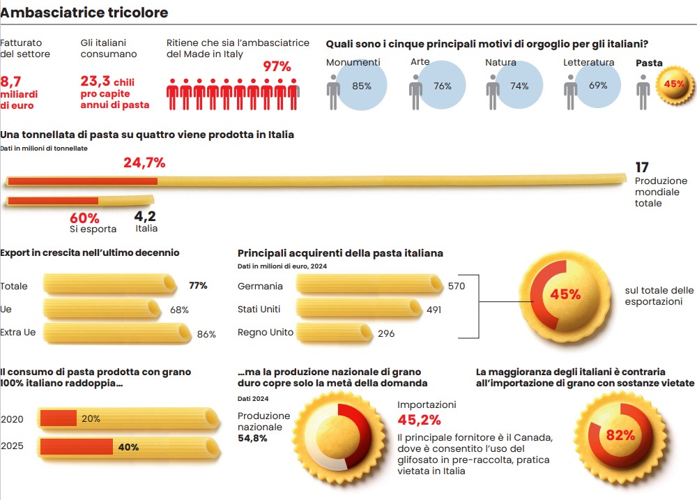 «Se l’Italia fosse rappresentata da un piatto, per sette italiani su dieci la pasta è la risposta, a testimonianza del suo status di simbolo gastronomico italiano indiscusso. Insomma, se dici cucina italiana, pensi pasta», ha riassunto Margherita Mastromauro, presidente dei pastai italiani di Unione italiana food. Un riconoscimento ottenuto grazie alla leadership nella produzione con circa 4,2 milioni di tonnellate nel 2024 su un totale di 17 milioni di tonnellate realizzate a livello mondiale.