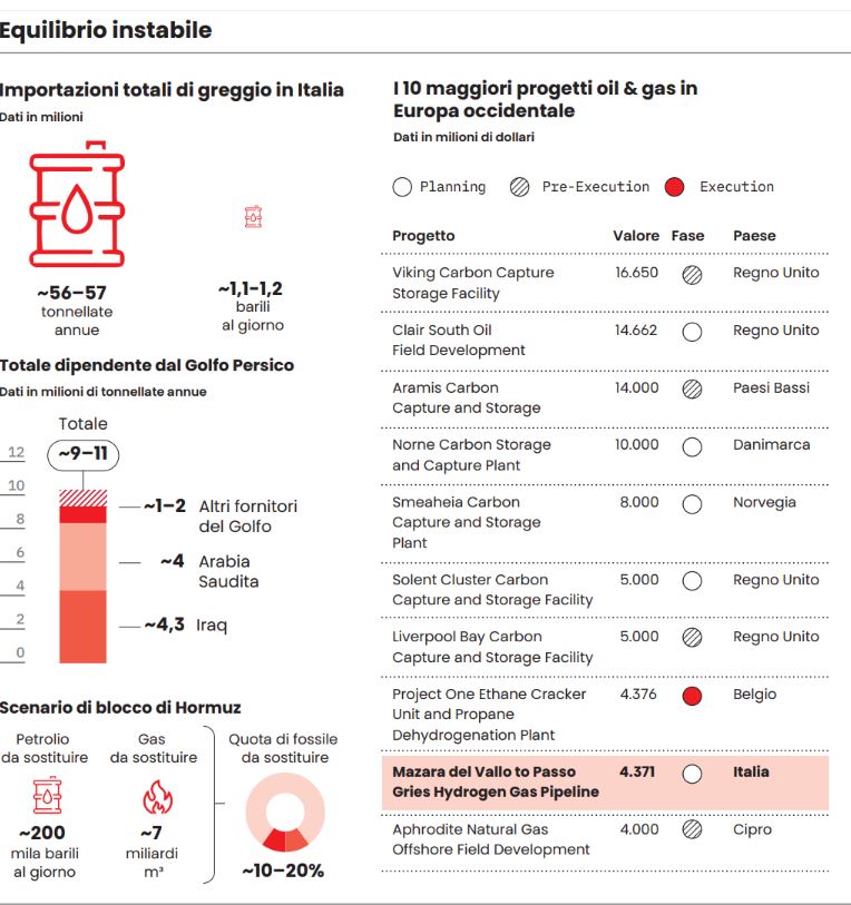 Fa riflettere, tuttavia, che in uno scenario come quello attuale, tra i 20 principali progetti definiti dall’Europa nel primo semestre 2026 (come mostra la tabella), figurino circa 13 progetti che riguardano impegni energetici rivolti più al futuro che verso le esigenze attuali: cattura del carbonio/Ccus, trasporto di CO2 o progetti sull’idrogeno. Uno sbilanciamento verso gli impegni green che continua a non aiutare il Vecchio Continente costretto a muoversi entro fasi altamente volatili.
