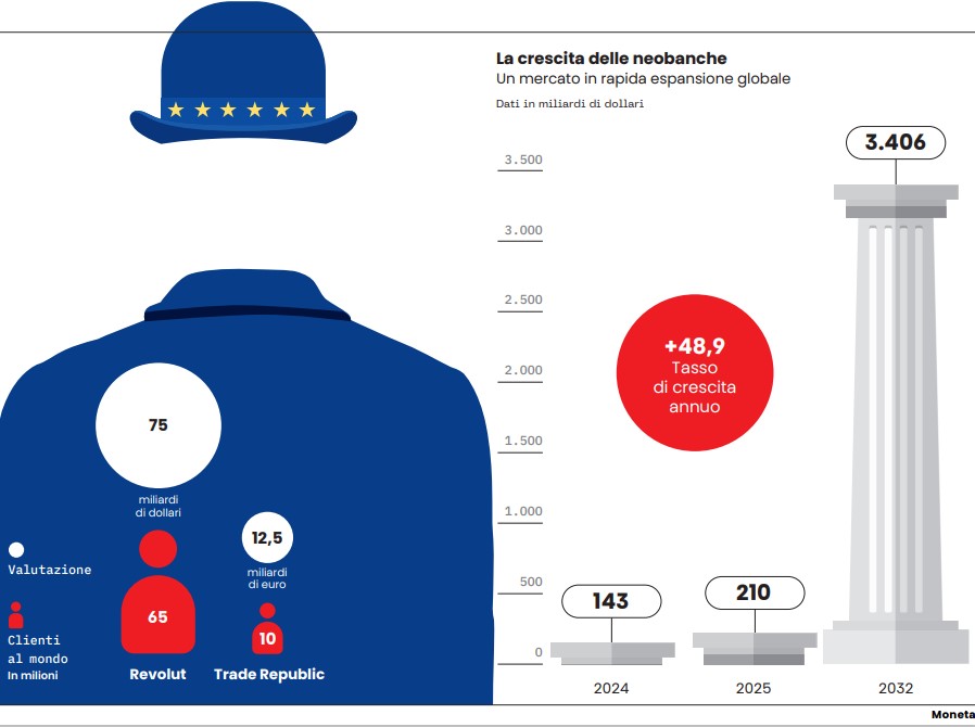 Quello delle cosiddette banche sfidanti è un’avanzata silenziosa ma rapidissima che, come abbiamo detto, vede Revolut alla guida. Con oltre 65 milioni di clienti nel mondo, più di 4 milioni in Italia e un’autovalutazione che sfiora 75 miliardi di dollari, la fintech britannica è entrata stabilmente tra le prime cinque banche italiane per numero di clienti. Più indietro, ma comunque a passo sostenuto, si muove la tedesca Trade Republic, che proprio prima di Natale ha raccolto nuove risorse per 1,2 miliardi di euro, portando la sua valutazione a 12,5 miliardi. Oggi conta oltre 10 milioni di clienti in 18 paesi europei, gestisce 150 miliardi di euro di masse e offre un conto corrente remunerato al tasso Bce (al 2%), oltre a investimenti anche sui mercati privati e un portafoglio cripto. Un mix che le banche tradizionali fanno fatica a replicare.