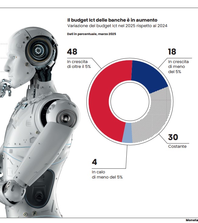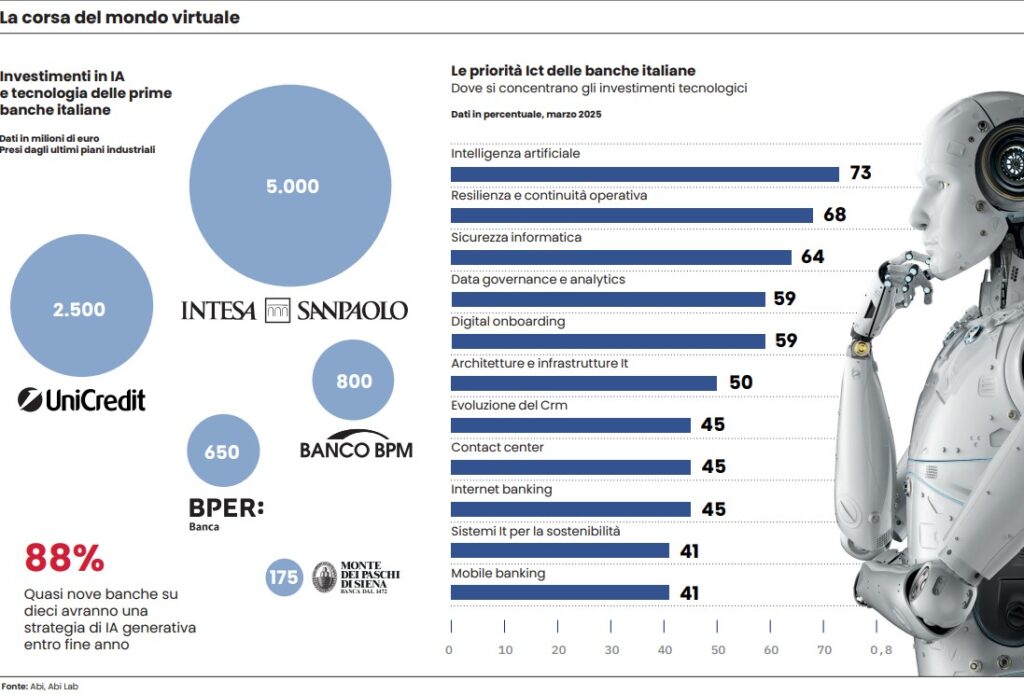 Basti pensare che Intesa Sanpaolo ha investito 5 miliardi di euro negli ultimi anni, mentre Unicredit ha stanziato 2,5 miliardi tra il 2025 e il 2027. Banco Bpm, invece, dopo avere inizialmente previsto nell’arco di piano 600 milioni, con l’ultimo aggiornamento ha portato la cifra a 800 milioni, sempre per IA e tecnologia. Una somma non troppo distante (650 milioni) è stata messa in conto anche da Bper, la banca del gruppo Unipol che ha da poco concluso l’acquisizione della Popolare di Sondrio.