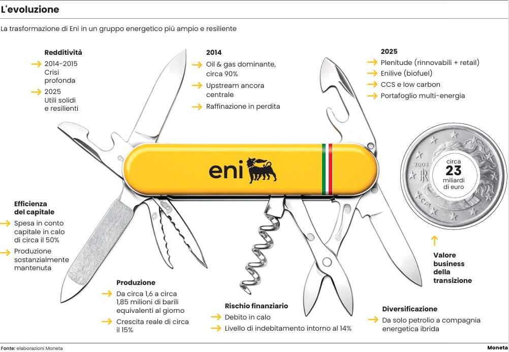 Il cambiamento si legge nei numeri: la capacità rinnovabile passa da zero (2014) a oltre 4 Gw nel 2024, mentre la capacità di bioraffinazione più che quadruplica. L’utile netto adjusted passa da circa 3,7 miliardi nel 2014 a circa 5 miliardi nel 2025, mentre il flusso di cassa operativo resta solido, intorno ai 12–15 miliardi annui, nonostante la volatilità del contesto energetico. Il debito netto si riduce e il livello di leva finanziaria rimane tra i più bassi del settore. Allo stesso tempo, Eni riesce a mantenere una politica generosa di dividendi e buyback. I risultati restano in parte legati all’andamento del petrolio e del gas, e i nuovi business, pur in forte espansione, hanno ancora strada da fare. Ma la riconfigurazione strategica è scritta e questi prossimi quattro anni per Descalzi saranno la “chiusura del cerchio”.