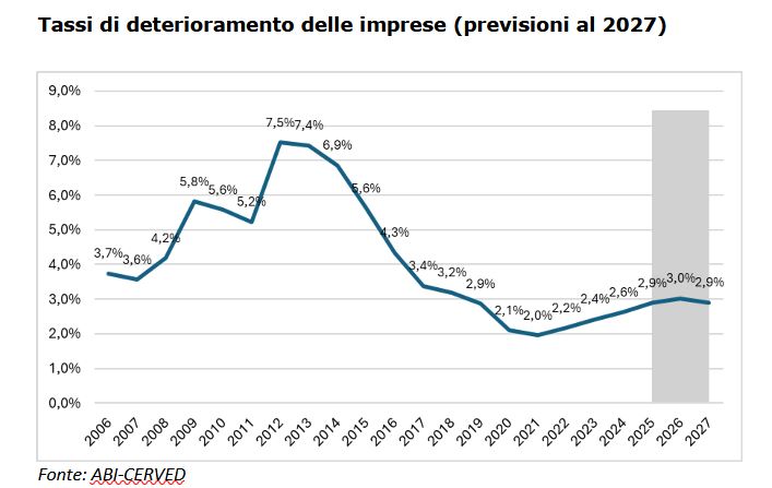 Nel 2025 il tasso di deterioramento del credito alle imprese – o tasso di default – si assesterà al 2,9% rispetto al 2,6% registrato nel 2024. La stima è di Abi e Cerved, che aggiungono che nel 2026 una crescita economica modesta dovrebbe spingere questo indicatore al 3%, nonostante il minor livello dei tassi di interesse di mercato. Nel 2027 il valore è dato in discesa al 2,9%, lo stesso livello del 2019 e di gran lunga inferiore al picco del 7,5% toccato nel 2012. A pesare il contesto economico ancora incerto e l’elevata instabilità geopolitica.