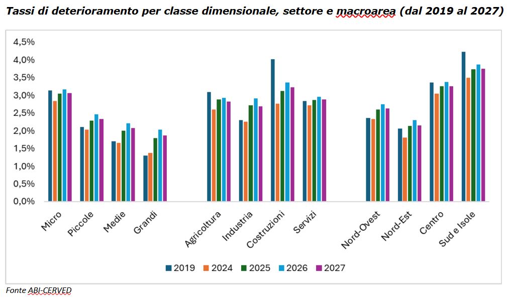 Nel periodo compreso tra il 2024 e il 2027, si prevedono incrementi più significativi dei tassi di default tra le grandi imprese (dall’1,4% all’1,9%), nelle aree del Nord-Est (dal 1,8% al 2,1%), del Nord-Ovest (dal 2,3% al 2,6%) e nel Sud e Isole (dal 3,5% al 3,8%). A livello settoriale, gli aumenti più marcati si stimano nel comparto delle costruzioni (dal 2,8% al 3,2%) e in quello industriale (dal 2,3% al 2,7%). A fronte di questa dinamica, a fine 2027 il tasso di deterioramento più elevato si conferma nelle microaziende (3,1% nel 2027), nel Sud e Isole (3,8%) e nel settore delle costruzioni (3,2%).