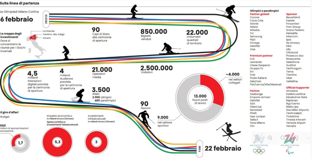 Secondo la ricerca Sport e Impresa: una partnership vincente, realizzata dall’Università Luiss, l’evento genererà un aumento della domanda del comparto sportivo pari a circa 1 miliardo, con risorse aggiuntive complessive di 1,142 miliardi. Considerando anche gli effetti diretti, indiretti e indotti, il contributo totale all’economia nazionale raggiunge quasi 2,9 miliardi. La sola organizzazione delle Olimpiadi potrebbe creare 13mila nuovi posti di lavoro, di cui oltre 9mila nel settore sportivo e quasi 4mila nei settori collegati. L’attesa è enorme: si prevedono oltre 2 milioni di visitatori, un’audience globale di 3 miliardi di spettatori e circa 850 mila biglietti venduti. L’area dei Giochi sarà vastissima, ben 22mila chilometri quadrati, tanto da far parlare di «Olimpiadi più diffuse della storia». Milano e Cortina saranno i due poli principali, ma molte gare si svolgeranno anche in Valtellina e in Val di Fiemme, mentre Verona ospiterà la cerimonia di chiusura.