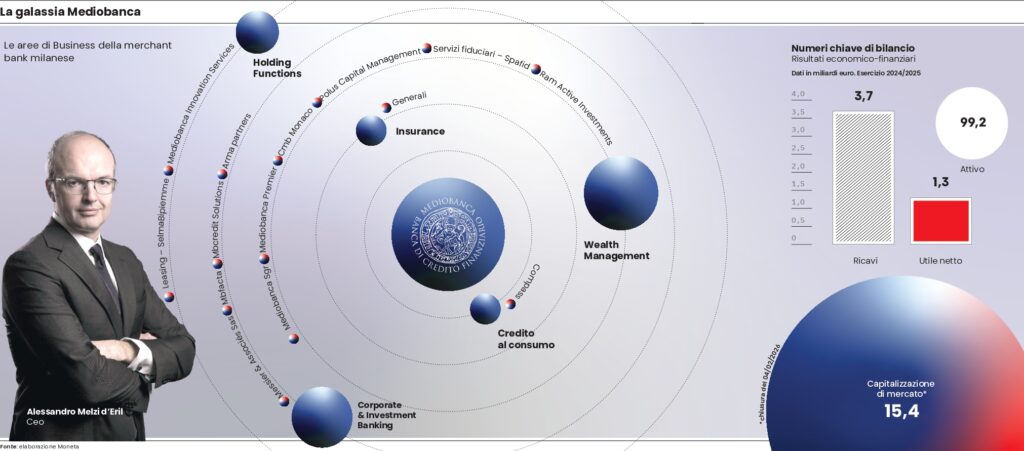 Secondo quanto raccolto da Moneta, un punto d’incontro potrebbe ruotare intorno alla partecipazione del 13,2% che detiene Mediobanca in Generali: l’idea alla quale starebbero lavorando gli advisor di Lovaglio sarebbe di completare il delisting di Mediobanca, fonderla e poi creare una società a parte con il brand di Piazzetta Cuccia dove ci sarebbero l’attività di banca d’investimento, la consulenza patrimoniale private e soprattutto il pacchetto di azioni di controllo del Leone di Trieste. In un secondo momento, si potrebbe anche valutare di ripristinare la quotazione di questa nuova entità. Soluzione, quest’ultima, che renderebbe praticabili in pieno le sinergie di ricavo e di costo da 700 milioni pianificate da Lovaglio. Tuttavia, tutto questo potrebbe non bastare. Perché non è solo la questione legata a Generali a non convincere la componente del cda di Mps in sintonia con l’imprenditore romano. Alla base ci sono anche argomenti concreti e di progettualità: nella testa dell’azionista Caltagirone, che ha già investito nuovi denari sul successo completo della scalata, sarebbe meglio procedere gradatamente, ripristinando una soglia di flottante (ora Mps ha oltre l’86% di Mediobanca) più importante di quella attuale, preservando la quotazione sul mercato della merchant bank. Questo avrebbe il vantaggio di non dover richiedere ai soci un nuovo investimento da 2,5-3 miliardi (è una stima che considera gli attuali corsi di mercato e un piccolo premio sul prezzo dell’azione). Non solo: ripristinando il flottante si potrebbe ambire a un incasso fra 4,5 e 5 miliardi di euro, tutta potenza di fuoco che potrebbe essere poi riversata nel nuovo, grande ballo del risiko che da più parti viene giudicato come imminente. A questo nuovo tesoretto, si andrebbe ad aggiungere il cospicuo capitale in eccesso nei forzieri del gruppo bancario: infatti, rispetto al target del 14% di Cet 1 (l’indice di solidità patrimoniale della banca) alla fine del terzo trimestre il capitale in eccesso era di circa 2,5 miliardi, somma che verosimilmente sarà diventata più importante alla fine del 2025 visto che l’istituto continua a macinare profitti e ha tenuto una politica sui dividendi fin qui morigerata. Va da sé che con un tale arsenale di liquidità, il ventaglio di obiettivi del Montepaschi potrebbe essere ampio e ambizioso e non la metterebbe in secondo piano rispetto a player più grandi, come l’arrembante Unicredit di Andrea Orcel.