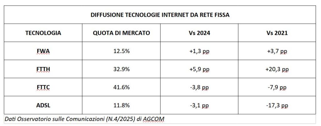 Come confermano i dati dell’Osservatorio sulle Comunicazioni (N.4/2025, con dati aggiornati a settembre 2025) di AGCOM, le linee in rame rappresentano solo l’11,8% del totale degli accessi da rete fissa con un calo 3,1 punti rispetto al 2024 e di 17,3 punti rispetto al 2021. Netto calo anche per la FTTC (fibra mista rame), con una quota del 41,6% degli accessi e un calo di 3,8 punti rispetto al 2024 e di 7,9 punti rispetto al 2021. Complessivamente, le connessioni in rame hanno perso 6,9 punti di quota di mercato rispetto al 2024 e 25,2 punti rispetto al 2021.