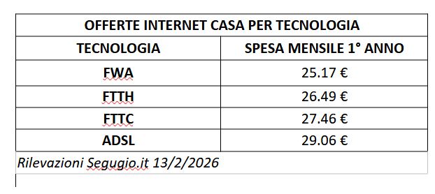 Cambiare tecnologia di connessione, per passare a una migliore (dalla FTTC alla FTTH oppure dall’ADSL alla FWA ad esempio), offre un doppio vantaggio. Oltre al passo in avanti in termini di esperienza d’uso, c’è la questione prezzo. La spesa media mensile, per il primo anno di abbonamento, delle offerte FTTH e delle offerte FWA è più bassa rispetto al costo medio da sostenere per un abbonamento FTTC oppure ADSL.