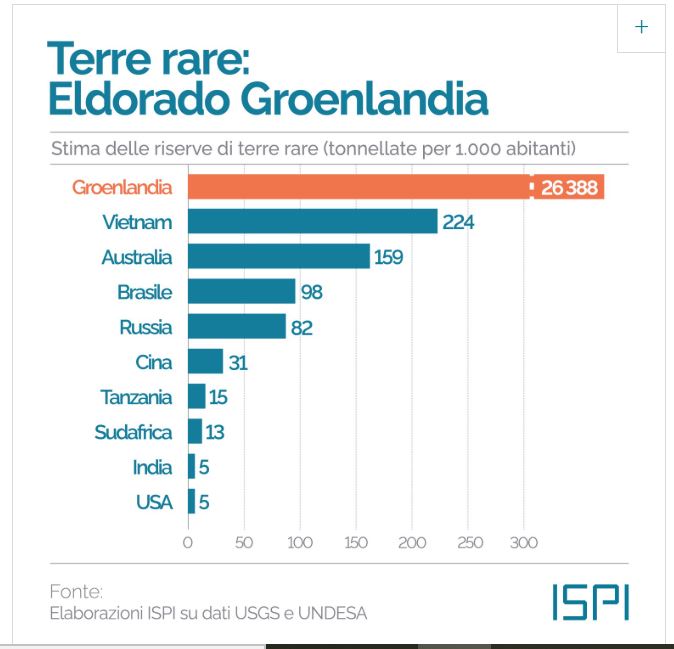 Presenti anche riserve di uranio, considerate le più grandi al mondo, nel sito di Kvanefjeld, e di terre rare. Per timori ambientali, però, è stata resa sostanzialmente impossibile l’estrazione di materiale radioattivo e di idrocarburi. E ancora cobalto, grafite, litio, nichel, rame e metalli di nicchia come il titanio, il tungsteno e il vanadio. L’isola possiede riserve per 43 dei 50 minerali considerati “critici” dal governo Usa.