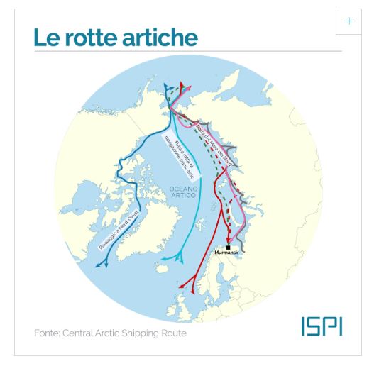 C’è poi, come ha sottolineato l’Ispi, la questione delle rotte artiche. Con il riscaldamento globale, nell’arco di due decenni, secondo uno studio della Brown University, vaste aree limitrofe al Circolo Polare Artico resteranno prive di ghiaccio per mesi. Questo significa che nel medio periodo sarà più semplice usare la rotta marittima del North West Passage (Nwp), che connette Oceano Pacifico e Oceano Atlantico passando vicino a Canada e Alaska, la Northern Sea Route (Nsr) che costeggia la Federazione Russa e l’Europa scandinava, e la Rotta Transpolare (Tsr) che taglia attraverso il Polo.