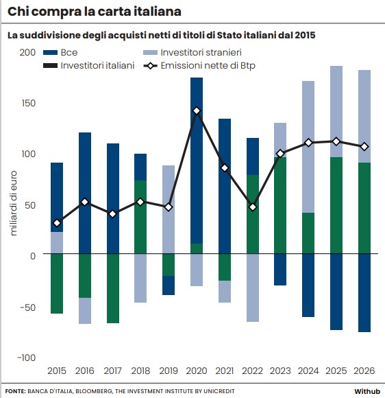 La sete di debito tricolore dovrebbe rimanere elevata con gli investitori esteri attesi in prima linea dopo gli acquisti significativi effettuati nel 2024 e nel 2025 di pari passo con il percorso virtuoso dell’Italia in termini di credibilità nella gestione dei conti pubblici.