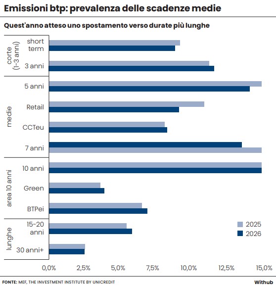 Molto attivo in questo inizio d’anno sarà il Tesoro italiano che nell’arco dei prossimi 12 mesi sarà chiamato ad emettere titoli di Stato a media-lunga scadenza per un valore compreso tra 350 e 365 miliardi di euro. Secondo gli analisti di Unicredit il Mef porterà avanti un programma di emissioni volto a limitare l’offerta sia nella parte breve che in quella extra-lunga della curva, mentre nella parte centrale di durata l’attenzione si dovrebbe spostare dai titoli a 5 anni a quelli a 7-10 anni, portando quindi a un moderato allungamento della scadenza all’emissione.