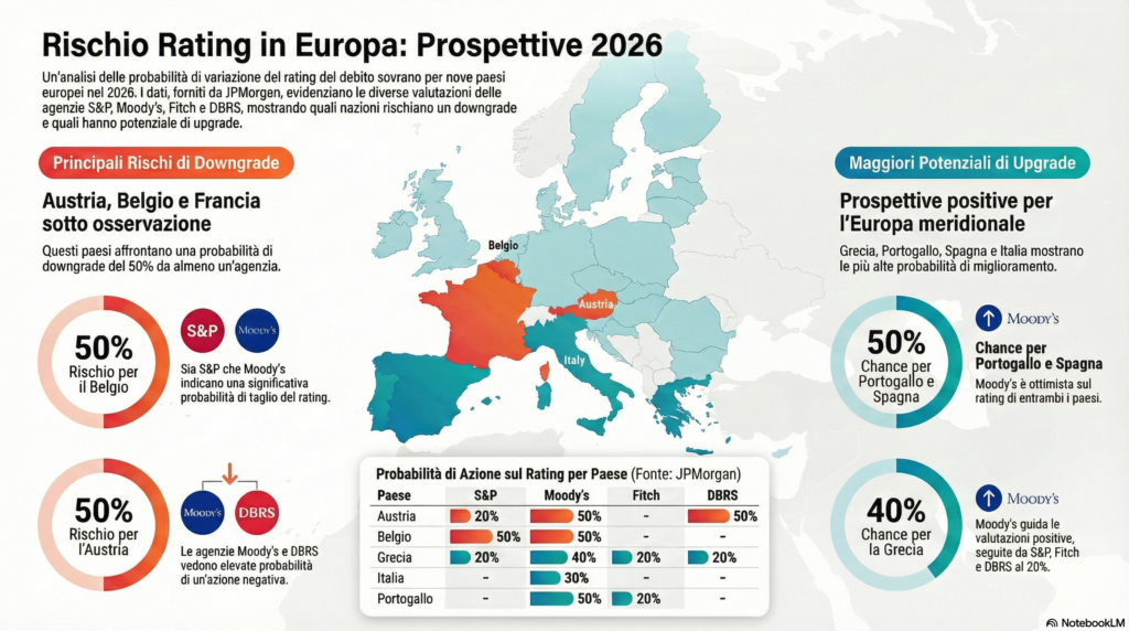 L’Italia fa mangiare ancora una volta la polvere a Parigi: secondo JP Morgan, nel 2026 Francia, Belgio e Austria hanno il 50% di possibilità di un downgrading da parte di almeno una delle agenzie di rating (Moody’s, S&P Global Ratings o Morningstar DBRS). Per il nostro Paese, invece, JP Morgan parla di un potenziale miglioramento, con un 30% di possibilità. Un’ulteriore promozione per il governo Meloni, dopo che a fine novembre Moody’s aveva alzato il suo giudizio sul Paese per la prima volta in 23 anni, portandolo da Baa3 a Baa2.