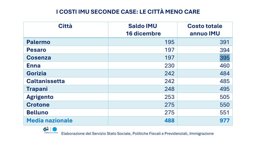 Le città dove l’Imu media è più cara sono Roma (3.499 euro all’anno), Milano (2.957 euro) e Venezia (2.335 euro). Seguono Torino, Firenze, Siena, Bologna, Padova, Verona e Salerno. La media nazionale è di 977 euro.