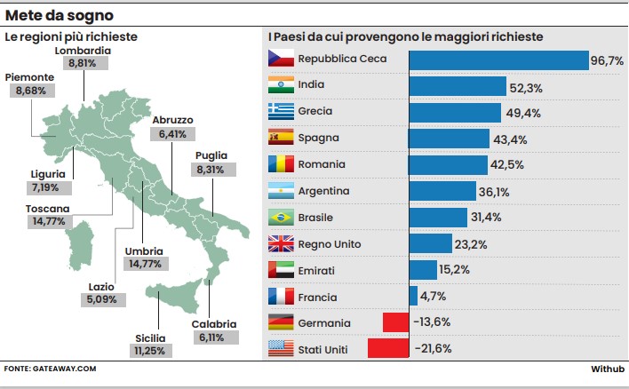 Il mercato italiano si fa più diversificato e meno dipendente da pochi Paesi. Si consolida una domanda più diffusa in Europa, con il Regno Unito che rafforza il proprio ruolo di secondo mercato (+23,2%) e la Francia in crescita moderata (+4,7%). Ma la vera novità è rappresentata dall’emergere di nuovi protagonisti: la Repubblica Ceca quasi raddoppia le richieste (+96,7%), seguita da India (+52,3%), Grecia (+49,4%), Spagna (+43,4%) e Romania (+42,5%). Cresce anche l’interesse dall’America Latina, in particolar Argentina (+36,1%) e Brasile (+31,4%), e dal Medio Oriente, con gli Emirati Arabi Uniti in aumento (+15,2%), in questo caso concentrati soprattutto sul segmento di lusso.