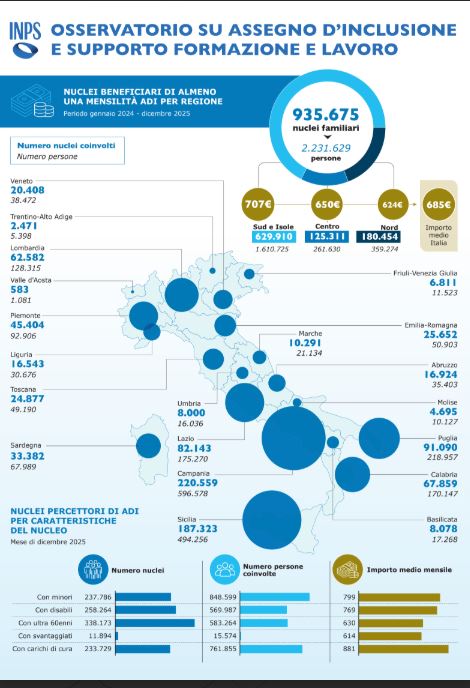 A Napoli a dicembre 2025 oltre 101 mila famiglie hanno ricevuto l’Assegno di inclusione (Adi) per un totale di 279.108 persone e un importo medio di 772 euro, una platea vicina a quella dell’intero Nord. Nel Settentrione, infatti le famiglie che a dicembre hanno ricevuto l’Adi sono state 116.382 per 215.548 persone coinvolte e un assegno medio a nucleo di 625 euro.