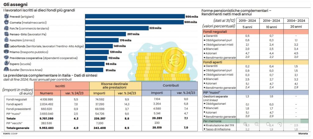 Il vantaggio a favore di operatori privati è certo. Ma è un problema, o una opportunità? Il flusso annuale di contribuzione previdenziale aggiuntiva, oltre a quella obbligatoria, nel 2024 ha superato i 20,5 miliardi di euro. Inevitabile che il mercato debba guardare con interesse a queste risorse. Fin qui le organizzazioni sindacali sono state le uniche attrici nella gestione della previdenza complementare per i dipendenti, potenzialmente una platea di 18 milioni di lavoratori, di cui poco più di 4 milioni iscritti ai fondi negoziali, a fronte di un totale di circa 10 milioni di iscritti a qualche forma di previdenza complementare. D’ora in poi i fondi chiusi (da Cometa a Fonchim, per citare i maggiori, dove la componente sindacale è sempre preponderante) dovranno accentuare l’attenzione verso i loro iscritti. La rendita di posizione è destinata a svanire. «I fondi pensione dovranno comunicare di più e meglio, dovranno preoccuparsi non solo di esibire bassi costi (certamente i costi di gestione dei fondi chiusi sono inferiori agli altri, ndr), ma soprattutto migliori prestazioni», commenta Corbello.