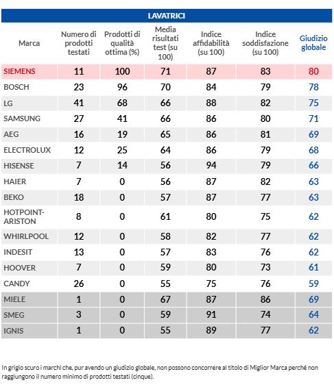 Siemens conquista il primo posto nella classifica delle migliori marche di lavatrici del 2025, seguita da Bosch e Lg. Siemens ottiene un punteggio complessivo di 80 su 100, Bosch si ferma a 78, ma resta la marca con i risultati più costanti nei test. Lg si piazza al terzo posto con 75 punti: bene soprattutto la silenziosità e la tecnologia a motore diretto.
