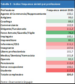 In termini di professione, gli studenti fanno registrare il valore più elevato (117,3), seguiti dai pensionati (112,4) e dai dirigenti/funzionari (111,2); gli appartenenti alle forze armate sono risultati essere la categoria con la minor sinistrosità (70,2), seguiti dagli imprenditori (80,1) e dalle casalinghe (89,3)