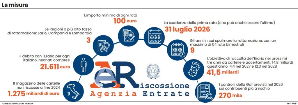 Il sistema di riscossione in questi anni ha generato un magazzino che vale 1.275 miliardi di euro di cartelle non riscosse a fine 2024, con un debito con l’Erario di 21.611 euro per ogni italiano, neonati compresi. L’obiettivo di raccolta dell’Erario nei prossimi tre anni da cartelle e accertamenti è di circa 45 miliardi: 14,8 miliardi quest’anno, 14,4 nel 2027 e 12,3 nel 2028, da ottenere anche grazie ai 270 mila controlli della Gdf previsti nel 2026 – ce lo chiede l’Europa con il Pnrr sui contribuenti più a rischio, concentrati in particolare nelle tre Regioni a più alto tasso di rottamazione: Lazio, Campania e Lombardia.