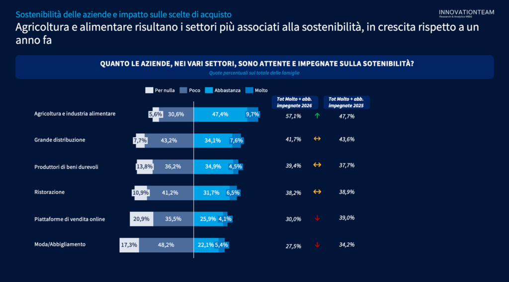 L’azione delle aziende non risulta tuttavia abbastanza solida nella percezione delle famiglie. L’impegno sulla sostenibilità è giudicato debole dal 50,6% dei consumatori, con un divario generazionale molto marcato: le fasce adulte (50-65 anni), esprimono la lettura più critica, mentre gli under 35 risultano relativamente meno severi. Una distanza che sembra essere legata più alla capacità delle imprese di renderlo visibile e credibile che all’assenza di azioni in merito. Non a caso, i settori che ottengono i riconoscimenti migliori sono quelli in cui il legame tra prodotto, filiera e territorio è più immediato, come agricoltura e industria alimentare, indicati come i più attenti alla sostenibilità dal 57,1% dei consumatori, in crescita rispetto a un anno fa.