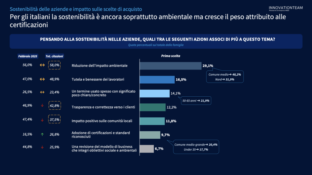 La sostenibilità emerge come un criterio sempre più rilevante nelle scelte di consumo. La percezione delle famiglie italiane sulle azioni di sostenibilità intraprese delle aziende sono legate all’impatto ambientale (fattore rilevante per il 58% delle famiglie) e alla tutela e benessere dei lavoratori (48,9%). Cresce l’attenzione anche verso elementi che rendono questo impegno più verificabile, come certificazioni e standard (+10,3 punti rispetto al 2025).
