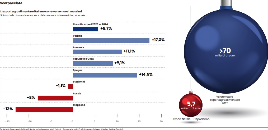Vini, spumanti, grappa e liquori, panettoni, formaggi, salumi e pasta Made in Italy non mancheranno dunque nei diversi continenti per le feste di fine anno e si stima che solo per il periodo di Natale 2025 e Capodanno 2026 si realizzerà complessivamente con l’export un fatturato di 5,7 miliardi, secondo la proiezione dell’Osservatorio Coldiretti su dati Istat del commercio estero relativa al mese di dicembre 2025. E per quanto riguarda il prodotto simbolo delle feste, le bollicine, secondo le previsioni faranno il botto soprattutto all’estero con circa 250 milioni di bottiglie ma anche in Italia salteranno 100 milioni di tappi.