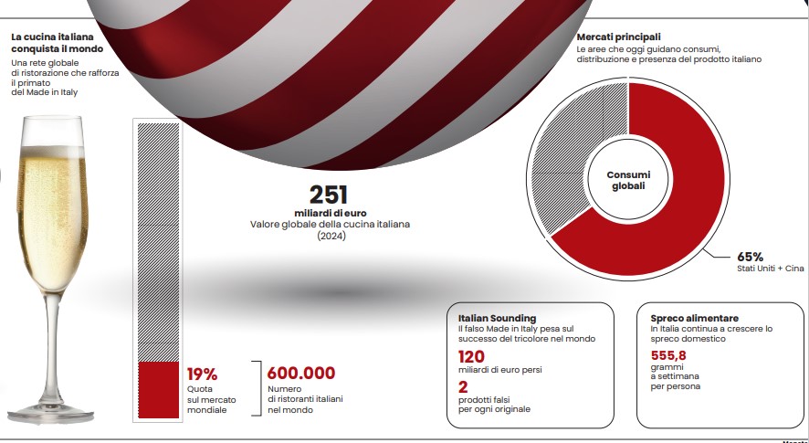 I brindisi Made in Italy dominano nettamente a livello internazionale sorpassando lo champagne francese, che però riesce ancora a spuntare mediamente prezzi superiori. Andamento frizzante anche per i cocktail Made in Italy con la «tendenza Spritz» a base di prosecco che si è affermata in tutti i principali mercati, a partire dagli Usa. A festeggiare saranno i circa 600.000 ristoranti che si definiscono italiani nel mondo secondo le stime della Federazione Italiana Pubblici Esercizi (Fipe) con una spinta alla crescita ulteriore della cucina italiana che nel 2024 ha raggiunto a livello globale un valore complessivo di 251 miliardi di euro e una crescita del 4,5% su base annua secondo Deloitte. La cucina tricolore rappresenta il 19% del mercato globale dei ristoranti con servizio al tavolo (Full Service Restaurant) ed è particolarmente rilevante negli Stati Uniti e in Cina, che insieme coprono oltre il 65% dei consumi globali per la tavola italiana.