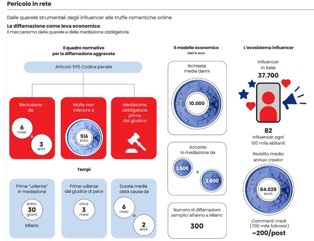 Una provocazione vera e propria, in realtà. L’influencer posta un video o un altro contenuto in cui esprime un’opinione urtante. A quel punto in tanti si sentono in diritto di criticare, ma quando il commento fuoriesce dai vaghi margini della continenza, il cosiddetto “diffamante” si trova nella cassetta postale la lettera dell’avvocato. «Paga, o ti querelo», è il messaggio. E il padre-madre di famiglia, che ha fatto l’errore di lasciarsi un po’ troppo andare con l’indignazione, che fa? Paga, naturalmente.